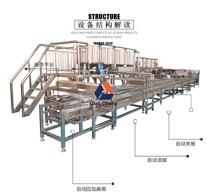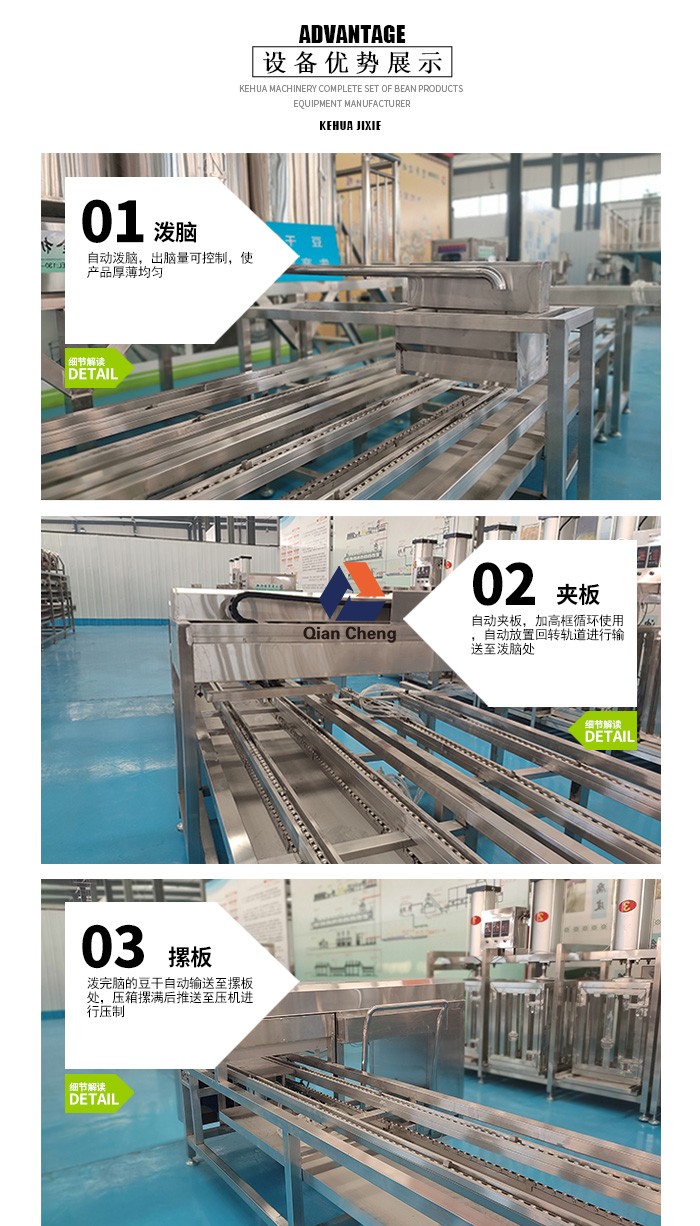 全自动豆腐干机采用微电脑控制,可以自动吸脑,自己搅脑,方便快捷,根据地区不同,调节薄厚程度和压制时间,生产多种产品,比如豆腐干,牛筋干,熏豆干等等。压箱底下有升降机,自动升降,让您每次都可以直立,在舒适的高度进行生产。生产完后有导轨推到压机上,很省力。压机采用气压机,干净卫生如需要,也可更换为油压的。宏金机械豆制品设备厂内机器型号齐全,总有一款适合您的机器!